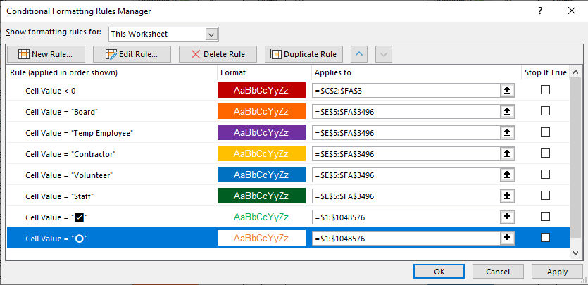 This screenshot shows the conditional formatting used on the Workforce Assignments tab. I use conditional formatting frequently to help call out data without having to apply formatting manually.