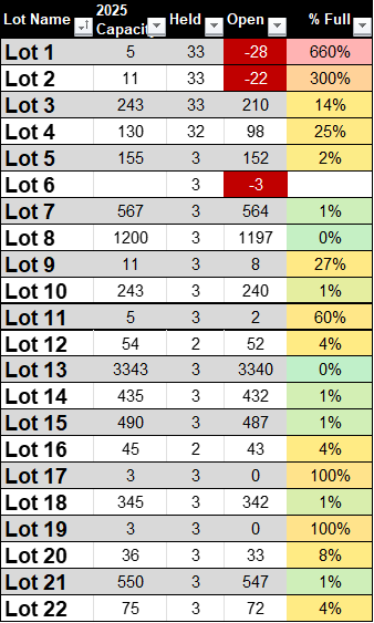 This sheet houses all data for lots used during the event. The “Held” and “Open” columns are automatically populated from the list containing all parking assignments.