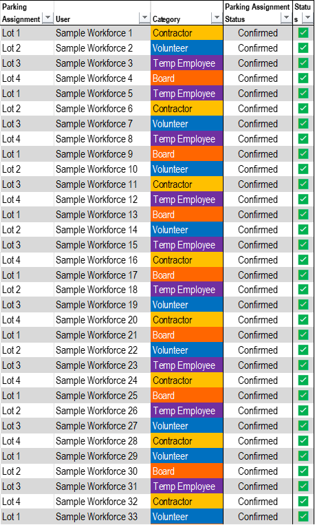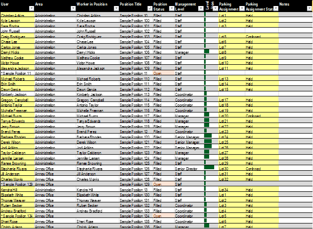 This tab tracks the parking assignments for all non-staff working individuals. The “Category” column is conditional formatted to help visually distinguish groups from each other.